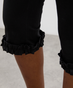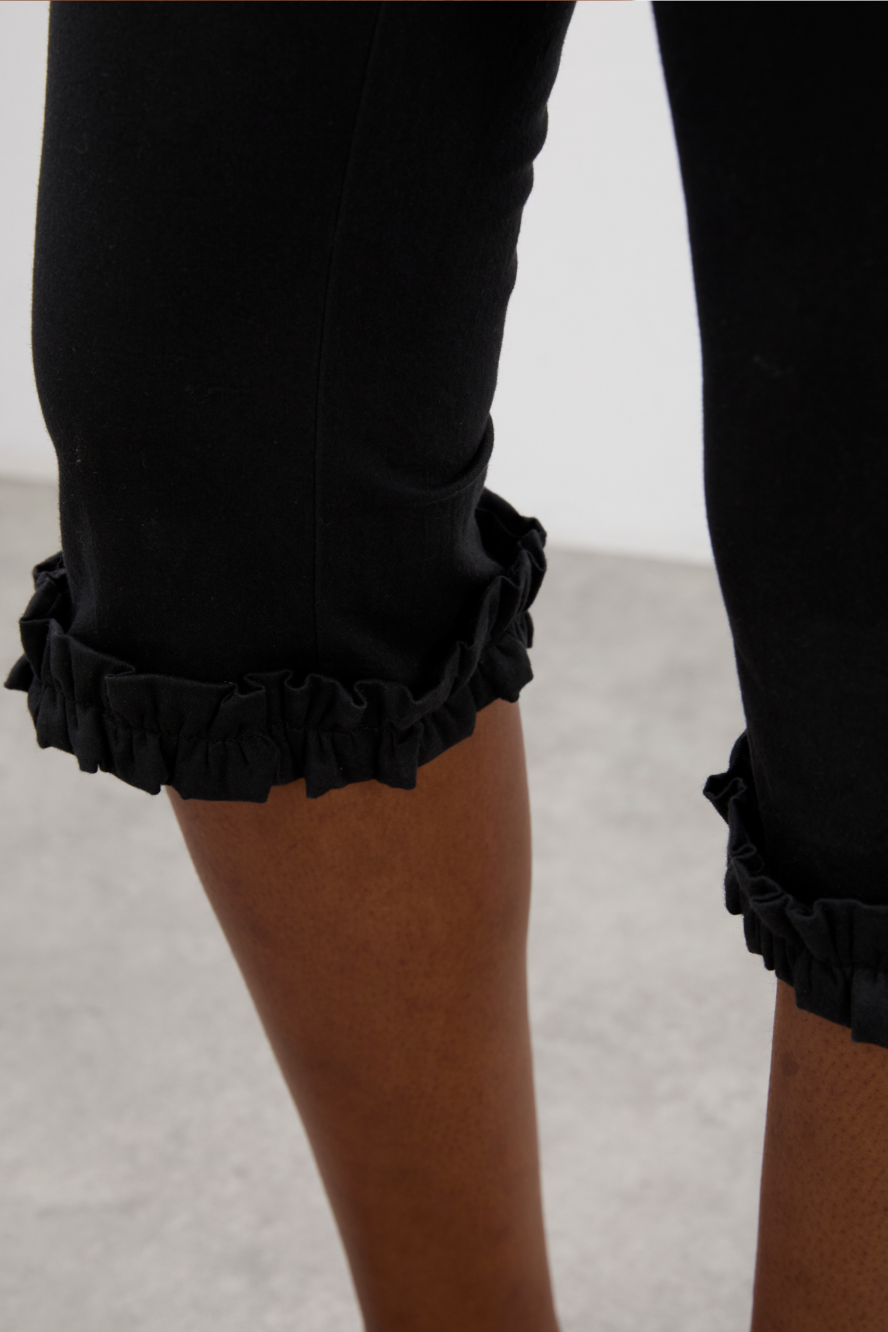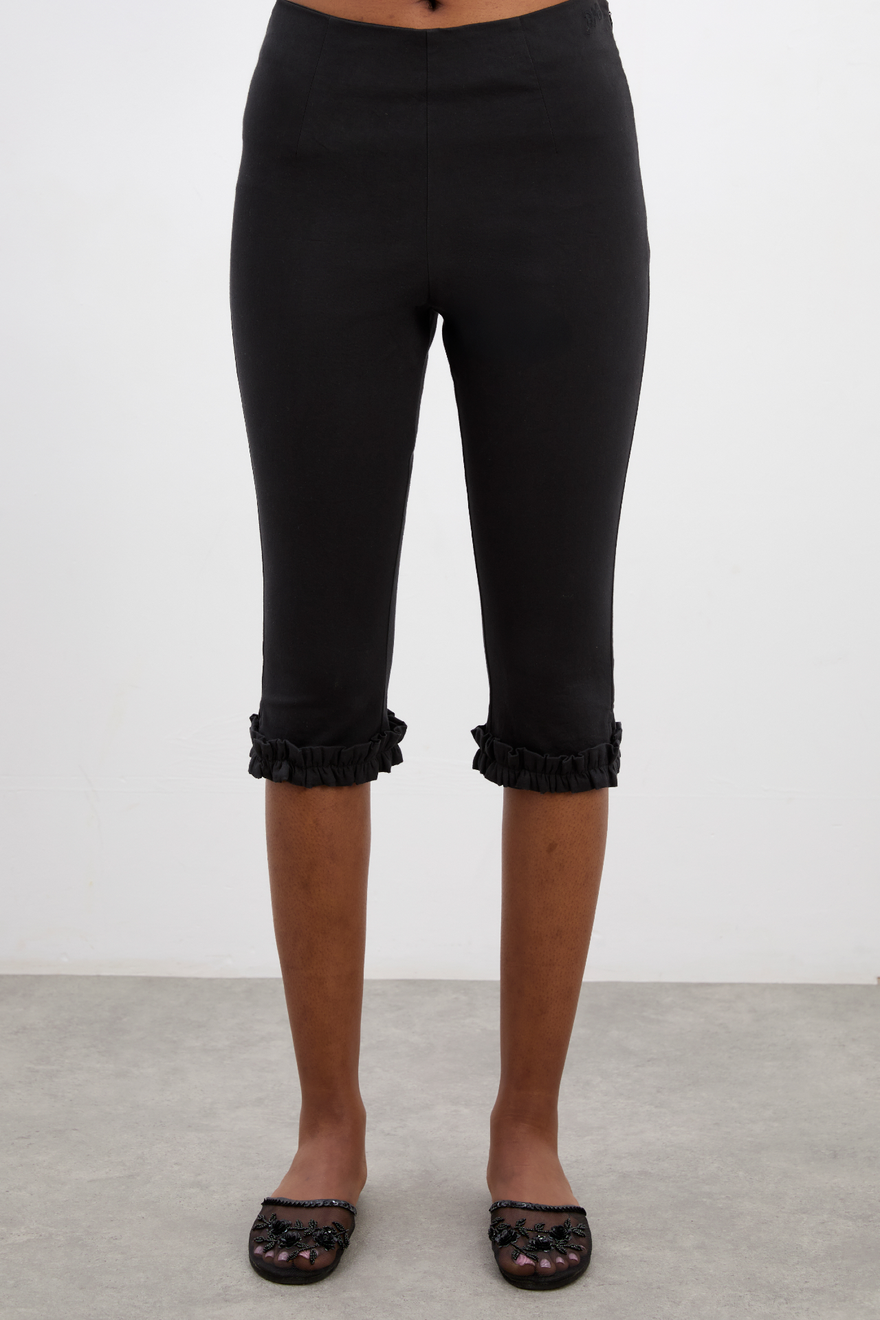 Meet your new summer staple, our Anisa Capri Pants in black are versatile and chic. Featuring back jett pockets and ruffles at the hem, they are crafted from a stretch fabric for comfort.