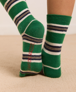 Meet our signature calf length socks in green stripe print. Crafted from 75% organic cotton, 23% recycled nylon, and 2% elastane, offering a perfect blend of comfort, durability, and a touch of stretch. The soft, organic cotton ensures a gentle feel against the skin, while the nylon and elastane contribute to enhanced flexibility and shape retention.