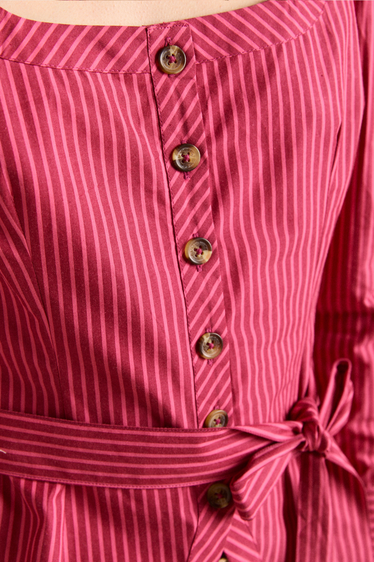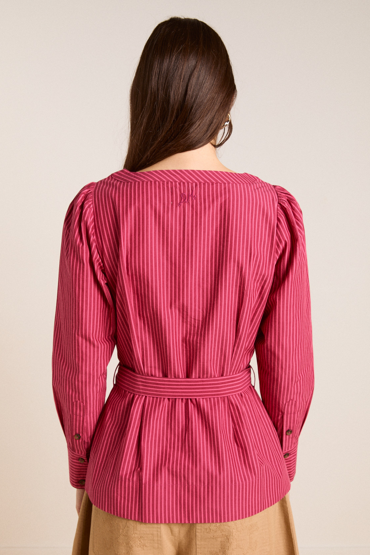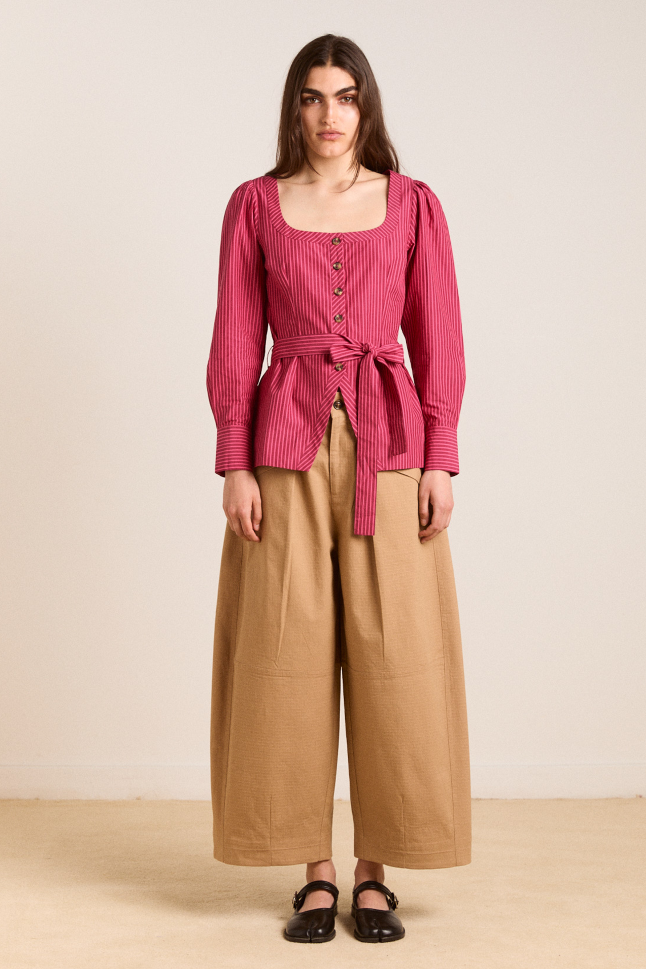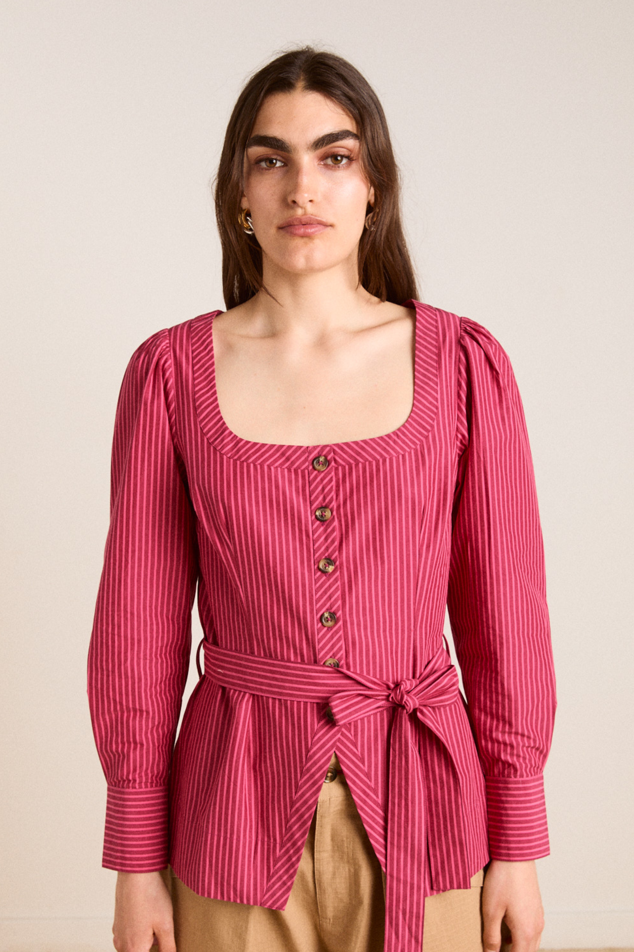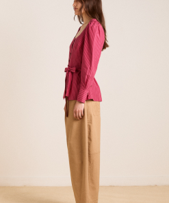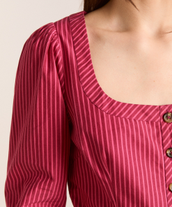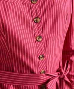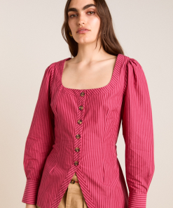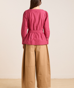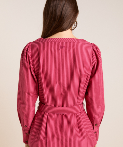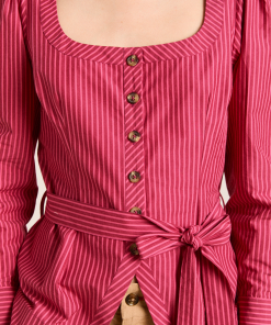 Meet the effortlessly wearable Clare Blouse. Crafted from 100% organic cotton in a striking berry business stripe, this blouse features a button up front with a flattering square neckline, and a removable belt to bring structure to the silhouette.