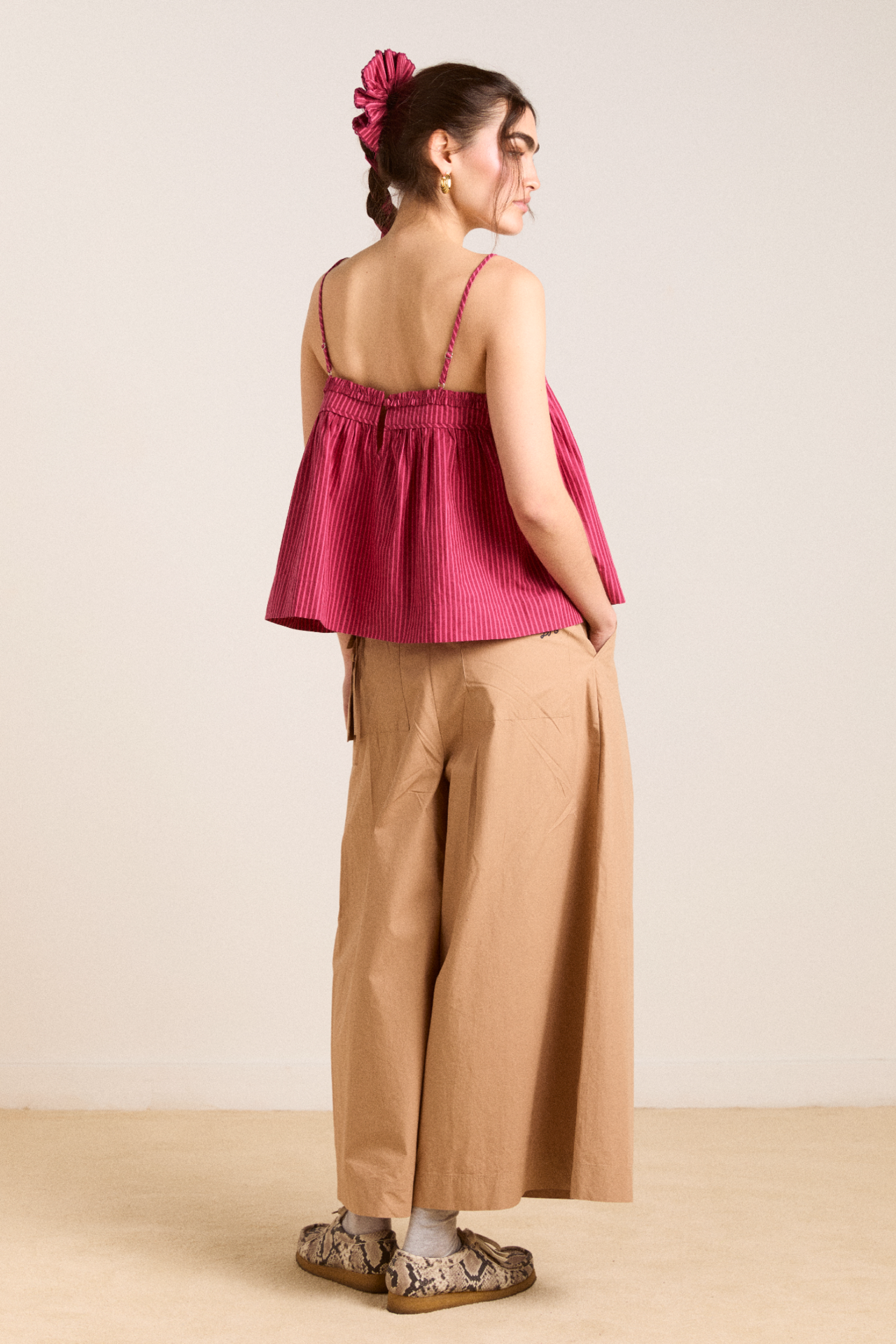 The perfect flowy summer cami, the Flynn in berry business stripe features a scoop neck with adjustable straps and a keyhole detail at the back. A swing shape provides a comfortable fit and breathability. Pair with our matching accessories.