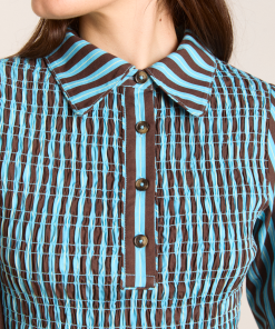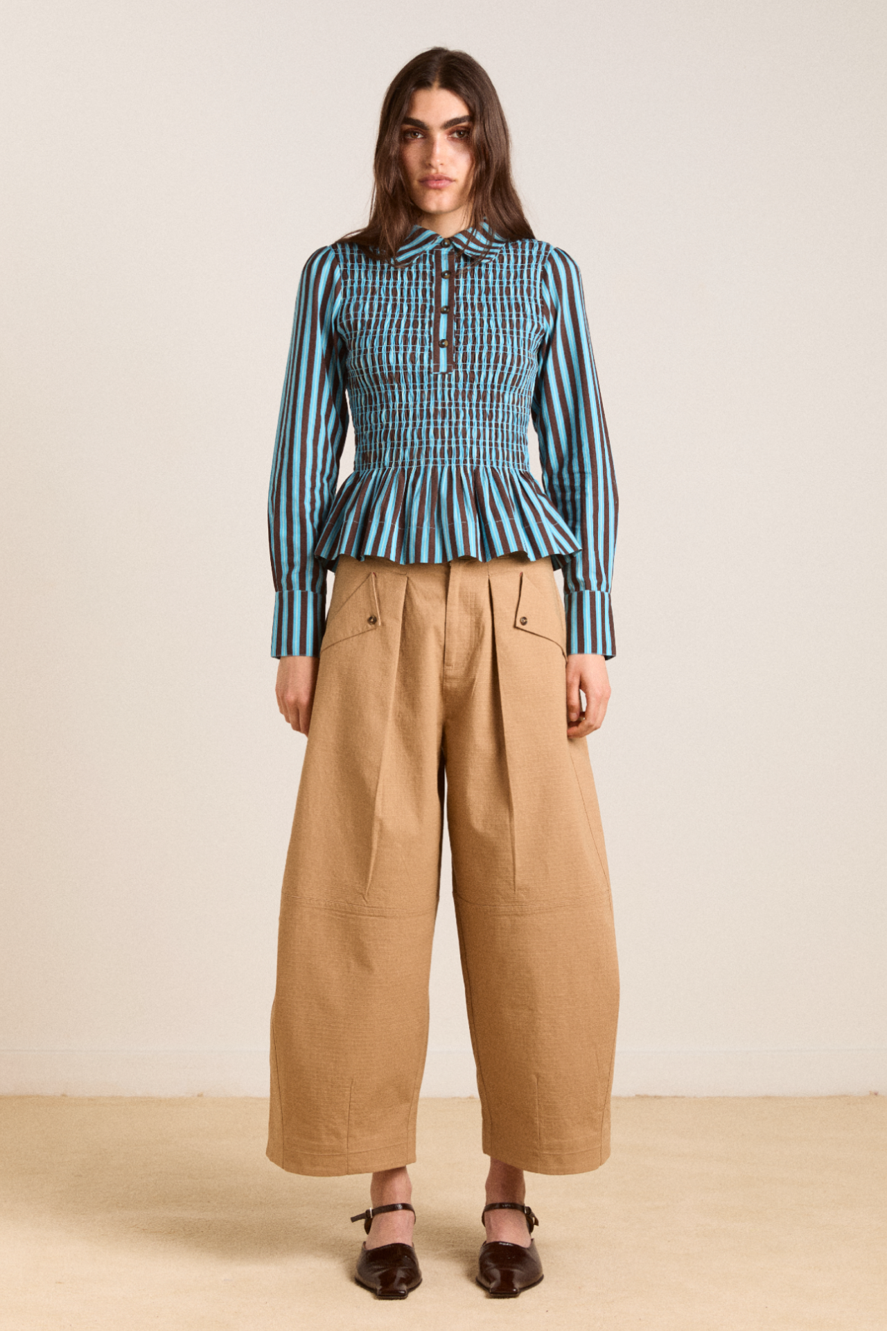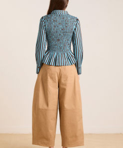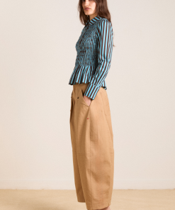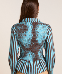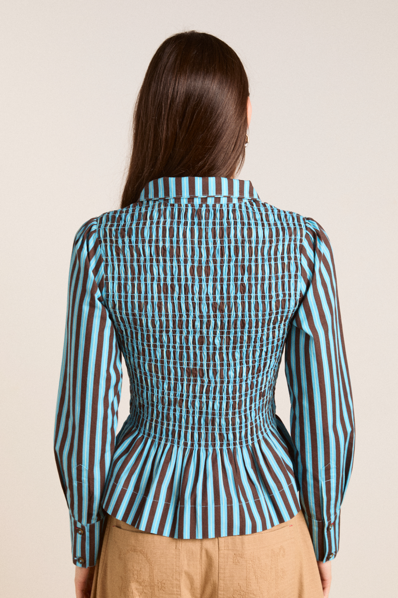 Our Hazel Shirt in blue choc stripe is the perfect mix of tailored and feminine. With shirred detailing, button down placket and a peplum hem, this 100% organic cotton top is a stand out piece. Pair with our matching accessories.