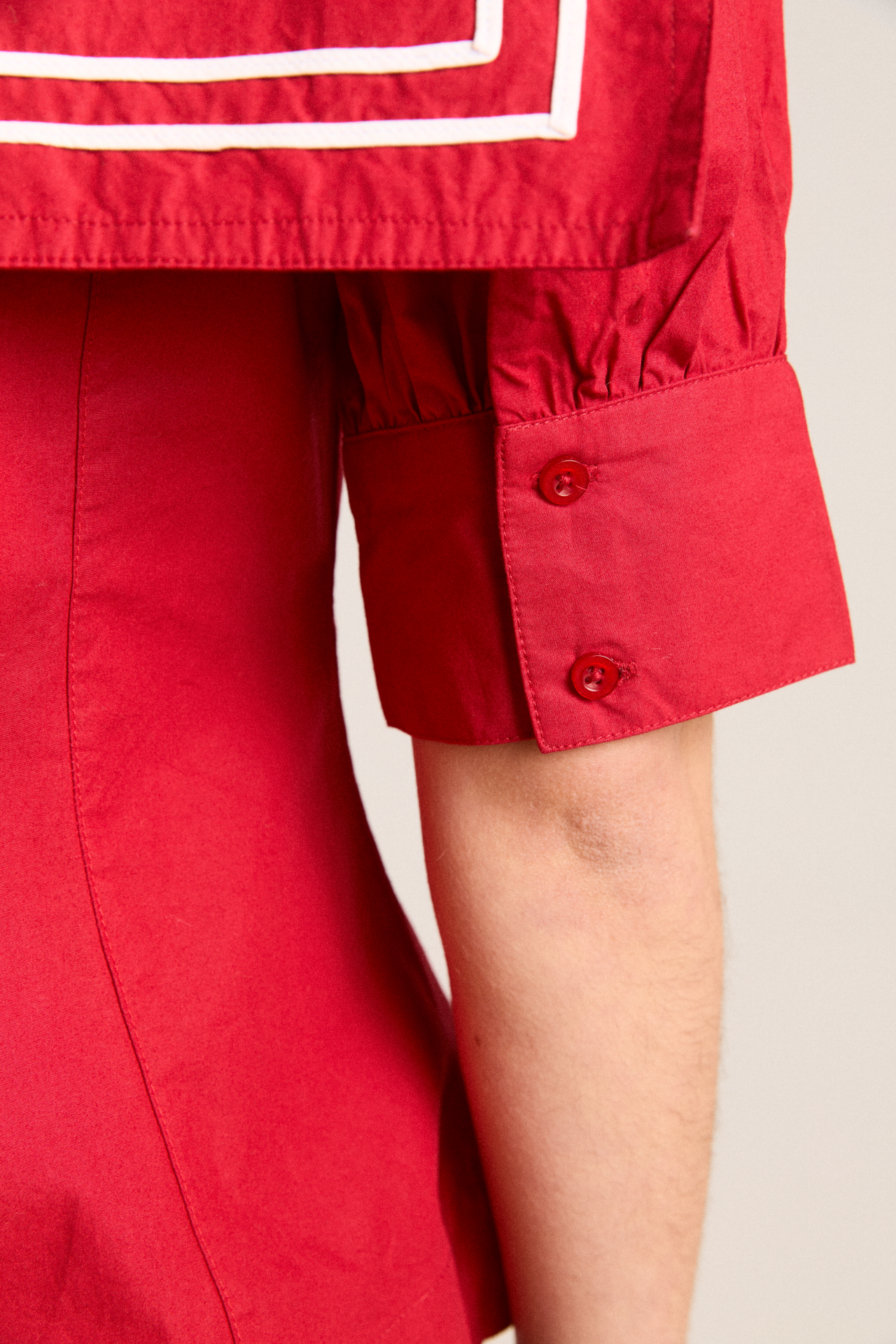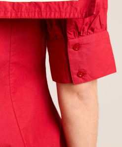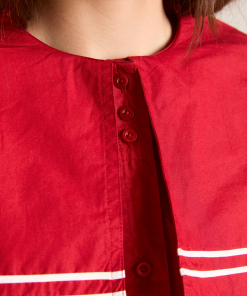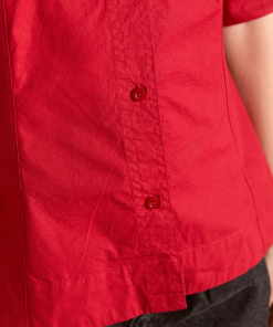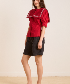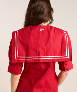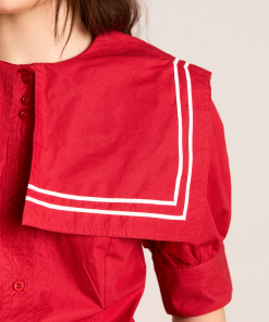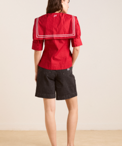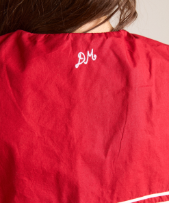 Our Keisha Blouse in cherry red offers classic, nautical charm with its button-down front and fitted cut. Made from 100% organic cotton, it’s a clean, crisp statement. Finished with our signature DM embroidery detailing on the back.