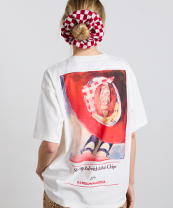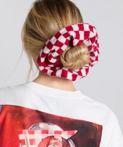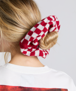 Go big with our oversized knitted scrunchie in red and ecru checkerboard.