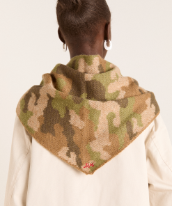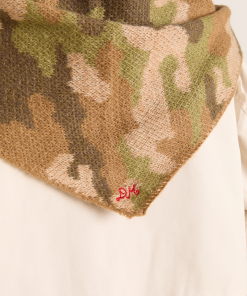 A versatile accessory in a camo knit design. Measuring 140cm x 42cm at its longest points, it can be styled as a headscarf or elegantly draped over the shoulders. Finished with crisp contrast white DM embroidery for a subtle signature detail.