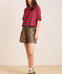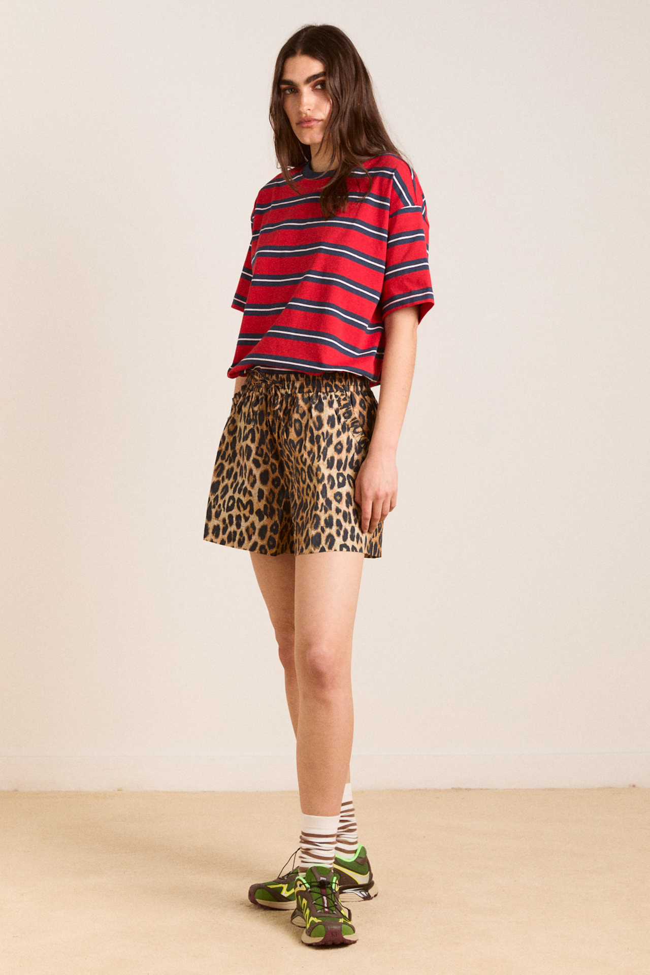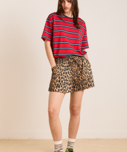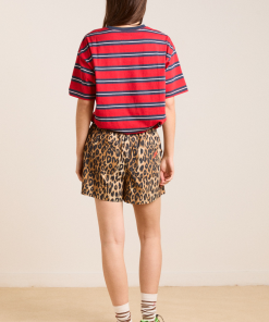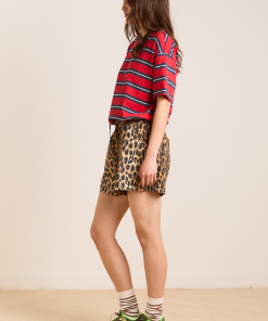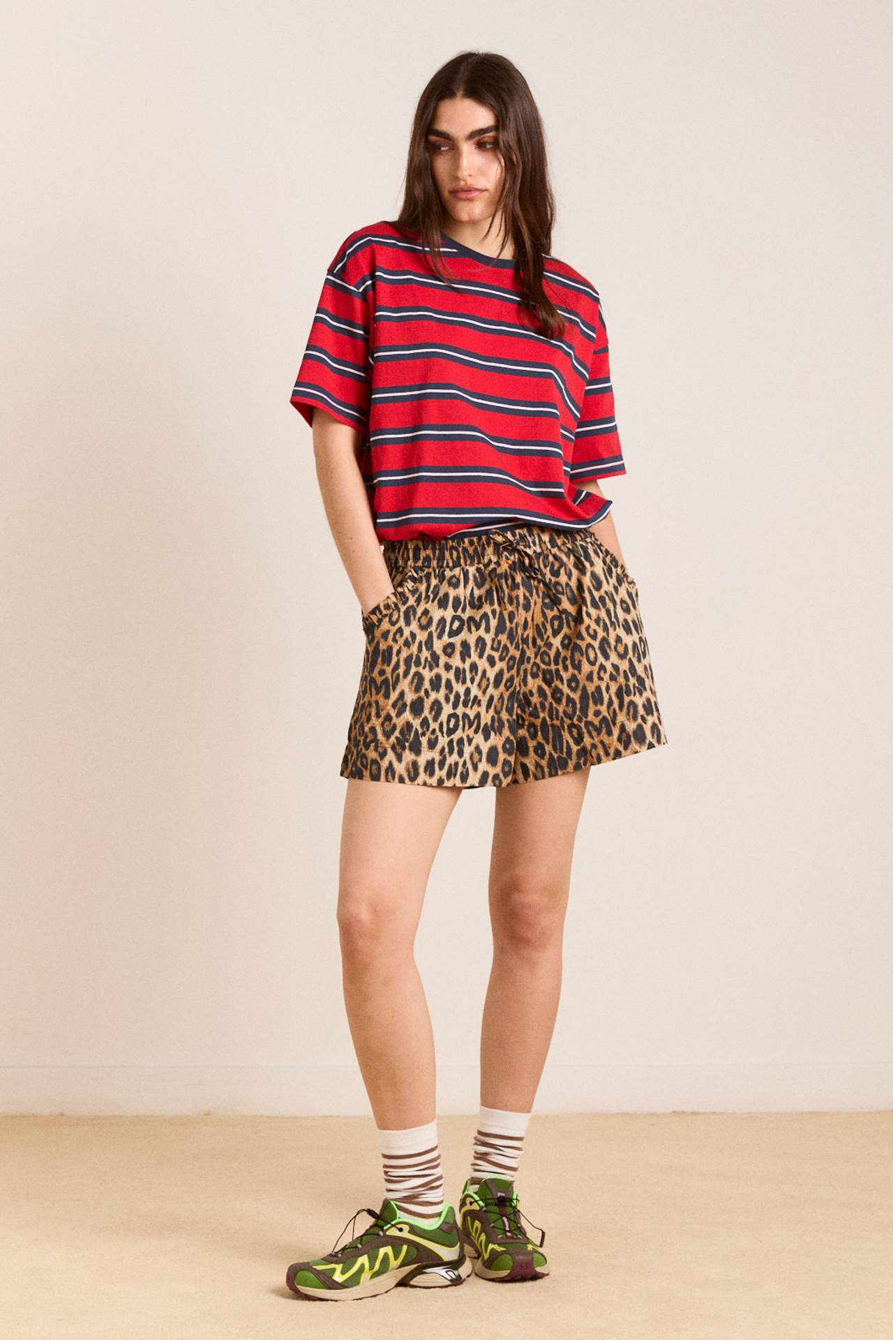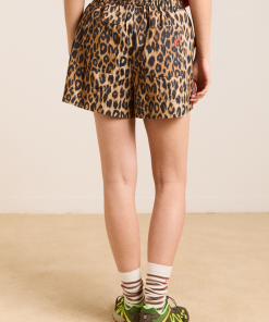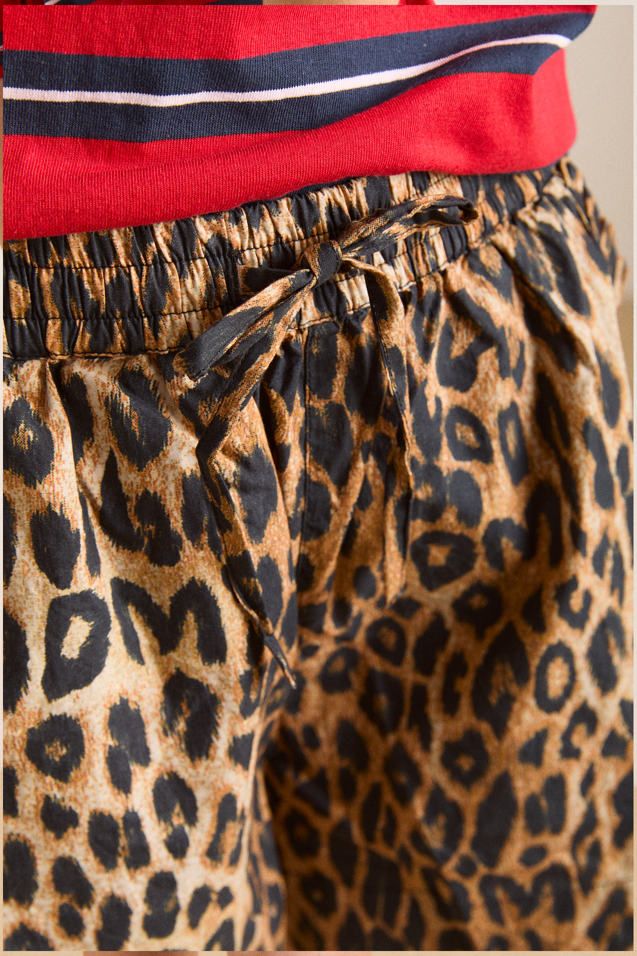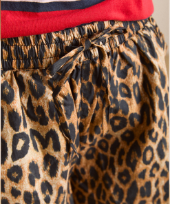 The pull on shorts feature an all over leopard print design, an adjustable tie up waist and frill pocket detail.