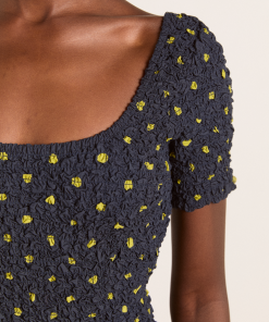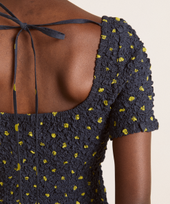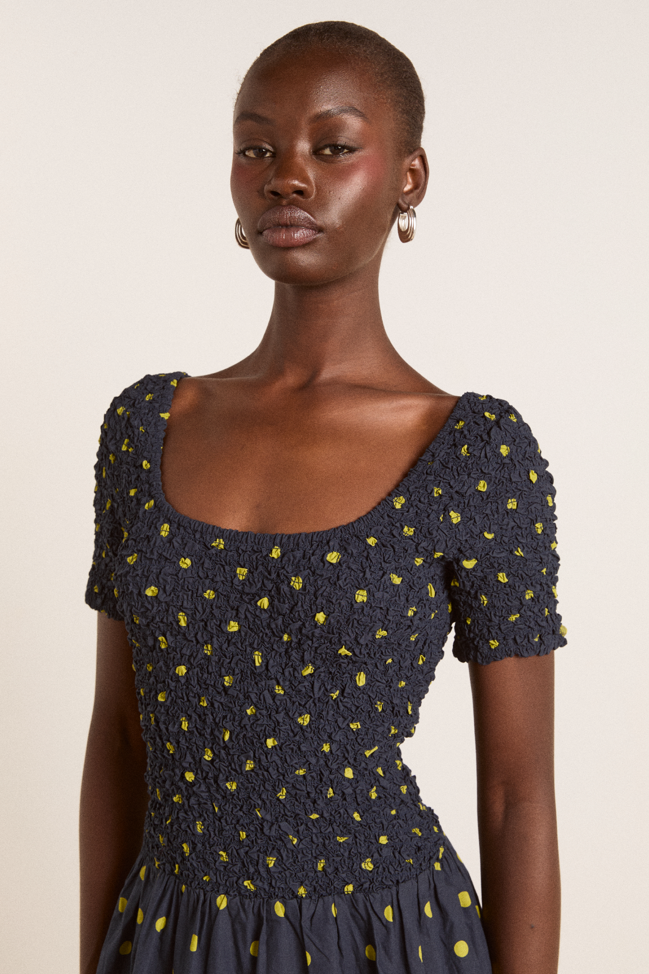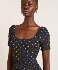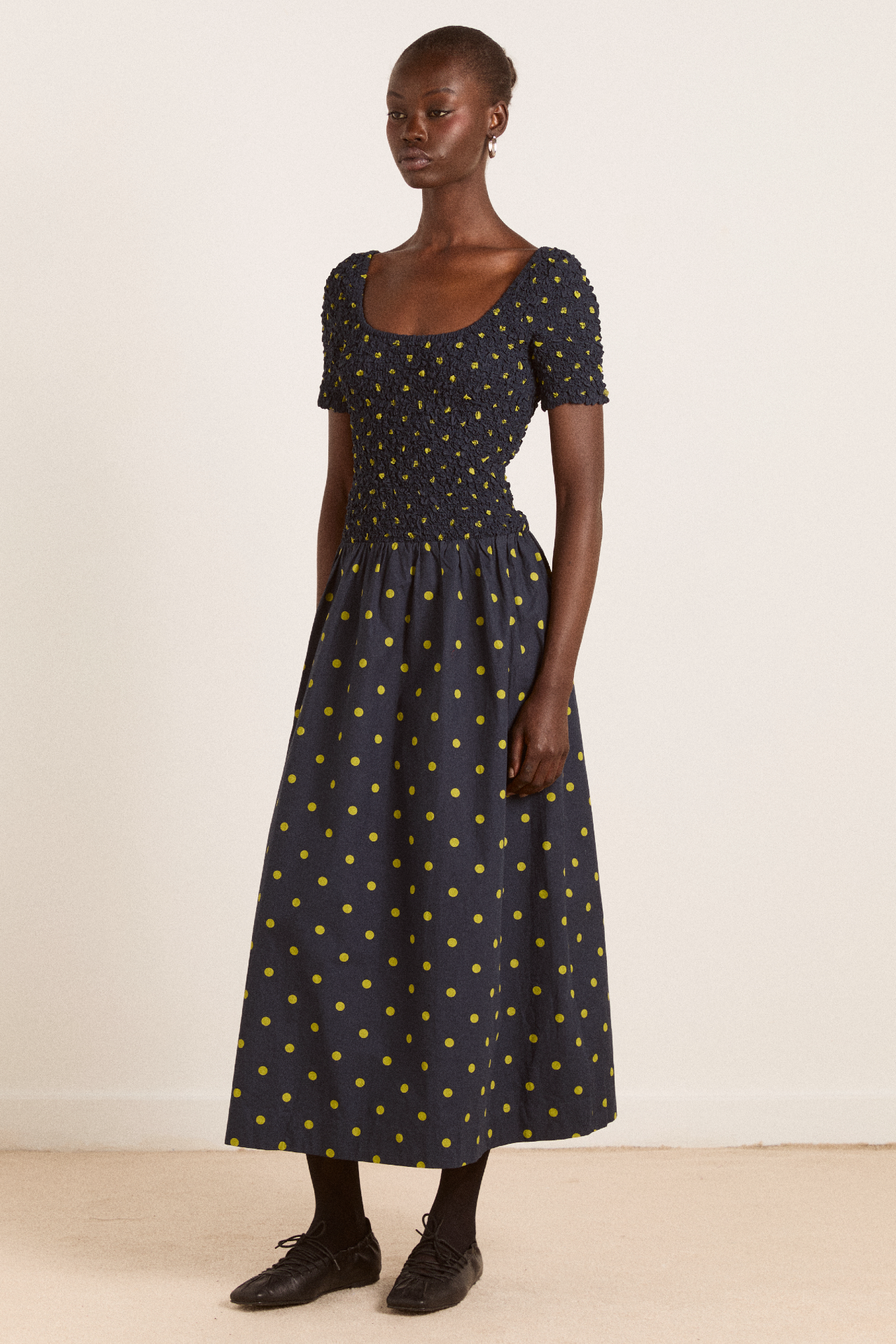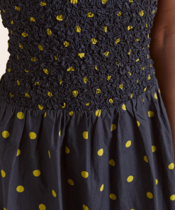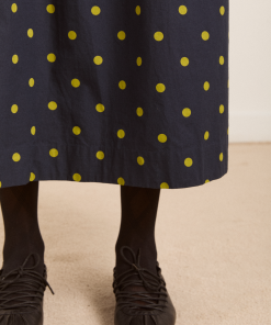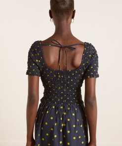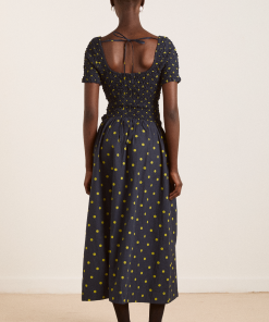 Crafted from 100% organic cotton, the Malinda Super Smocked Midi Dress in navy olive spot is adorned with an all over spot print. Designed with a square neck and hand smocked bodice and sleeves for a flattering fit. The Malinda will effortlessly carry you from day to night.