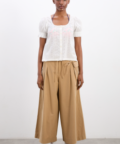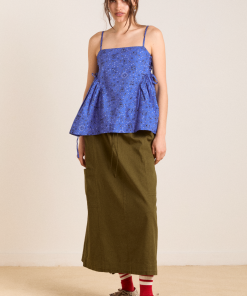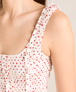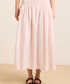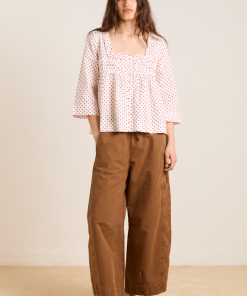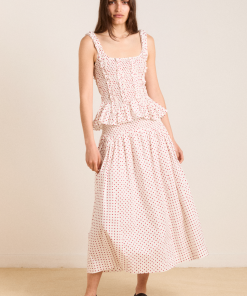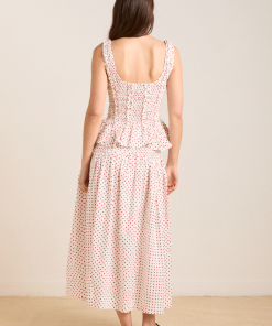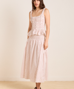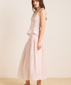 The Raphi Cami in off white and red spot is a sleeveless, square neck top with a shirred bodice and peplum hem. Finished with ruffle detailing for a feminine, vintage touch. Made from 100% organic cotton, it pairs perfectly with the Layla Skirt in off white and red spot.