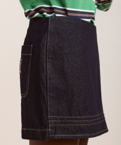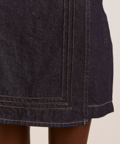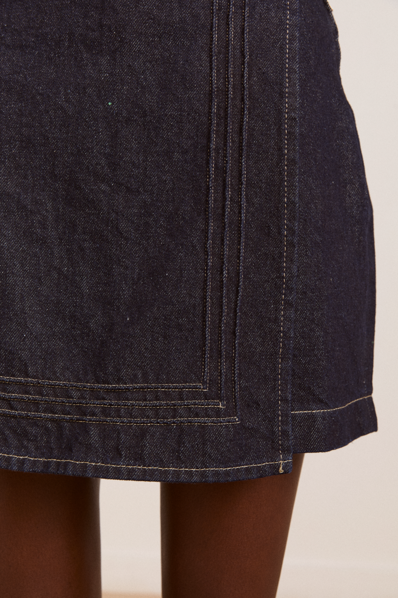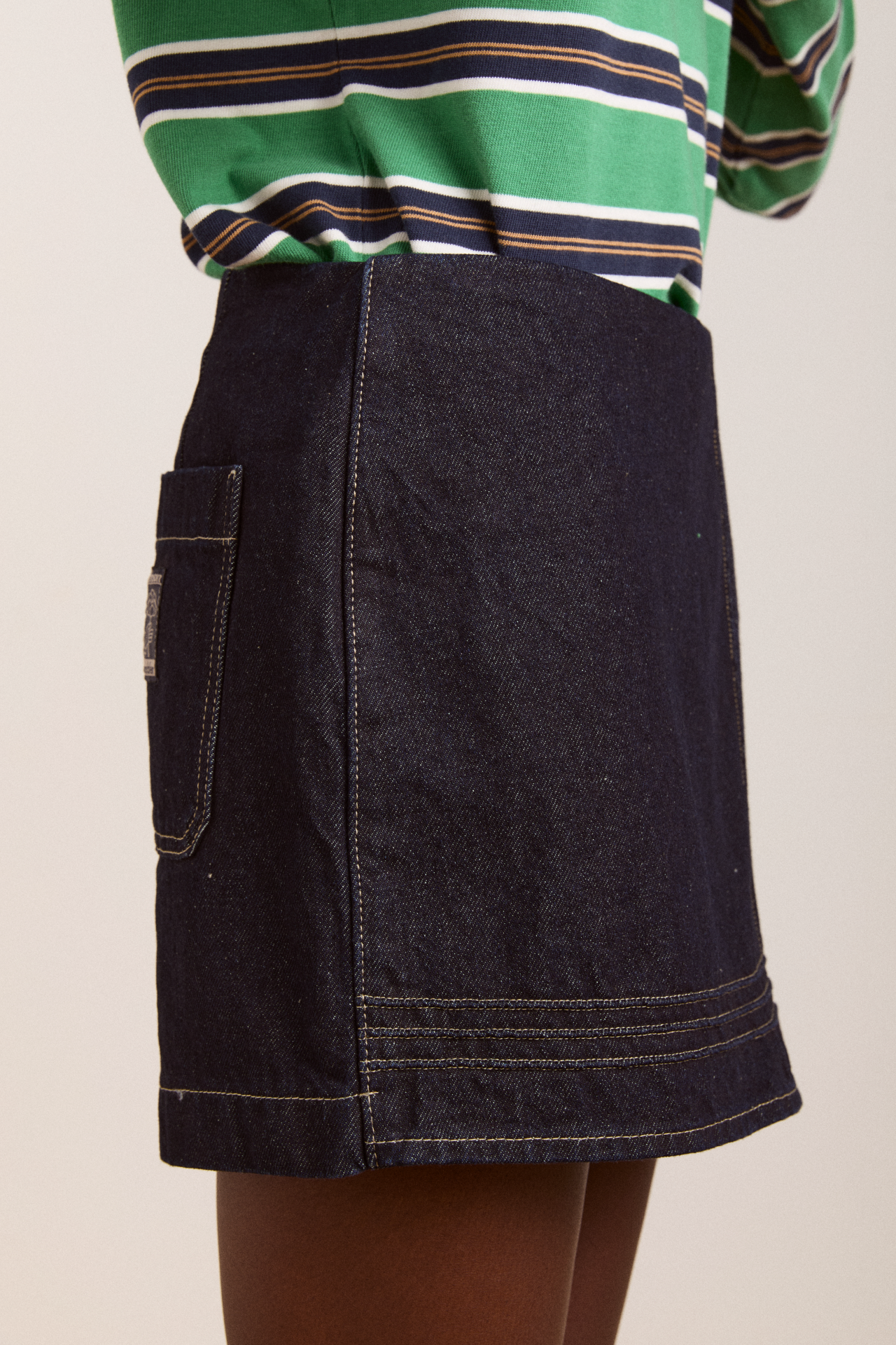 A fresh take on a classic style, the Rory Skirt in indigo denim offers a front wrap fit with pin tuck detailing. Crafted with a blend of organic and recycled cotton, this timeless piece features practical front and back pockets, as well as a signature woven DM patch on the back pocket.