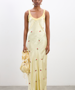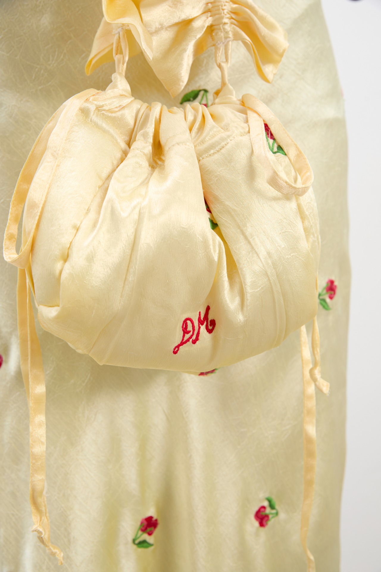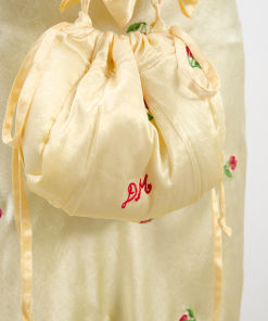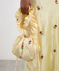 Meet our Simone Satin Scrunchie Bag in butter yellow. Finished with all over rose embroidery detail, an adjustable scrunchie strap and draw string closure, the Simone will keep your essentials secure in style.