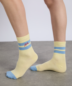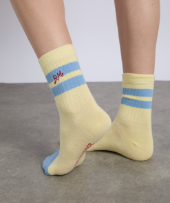 Our calf length socks boast a yellow & blue sporty stripe design.