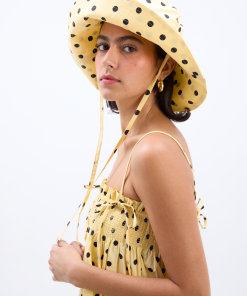 Our bestselling sun hat is back in our butter yellow and black polka dot print. Made from 100% organic cotton featuring tie detailing and our signature DM embroidered logo, it’s a summer staple.