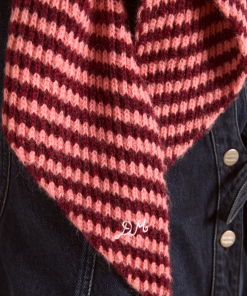 This 100% wool striped knit hood can be styled multiple ways – worn as a hood, tied at the front, or wrapped as a scarf. Finished with a contrast pink DM embroidery for a subtle branded detail.