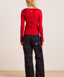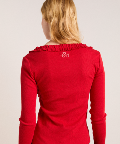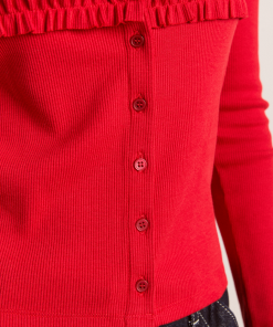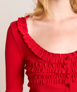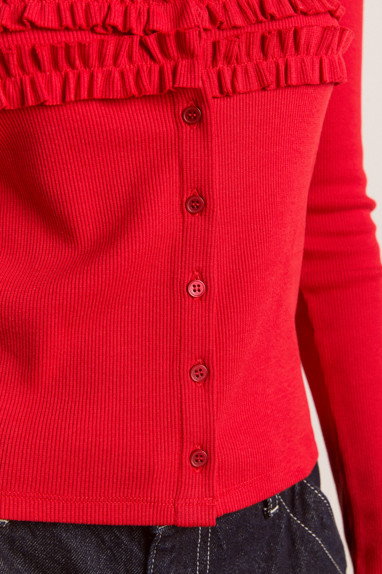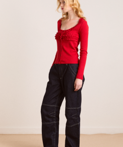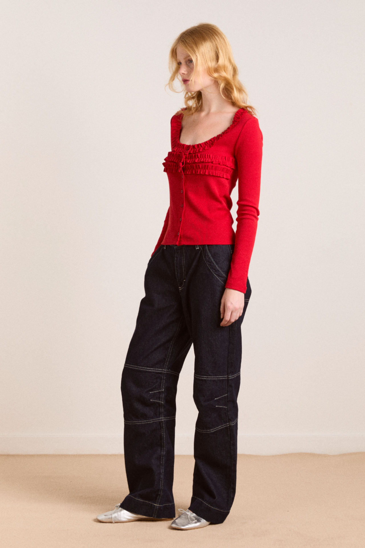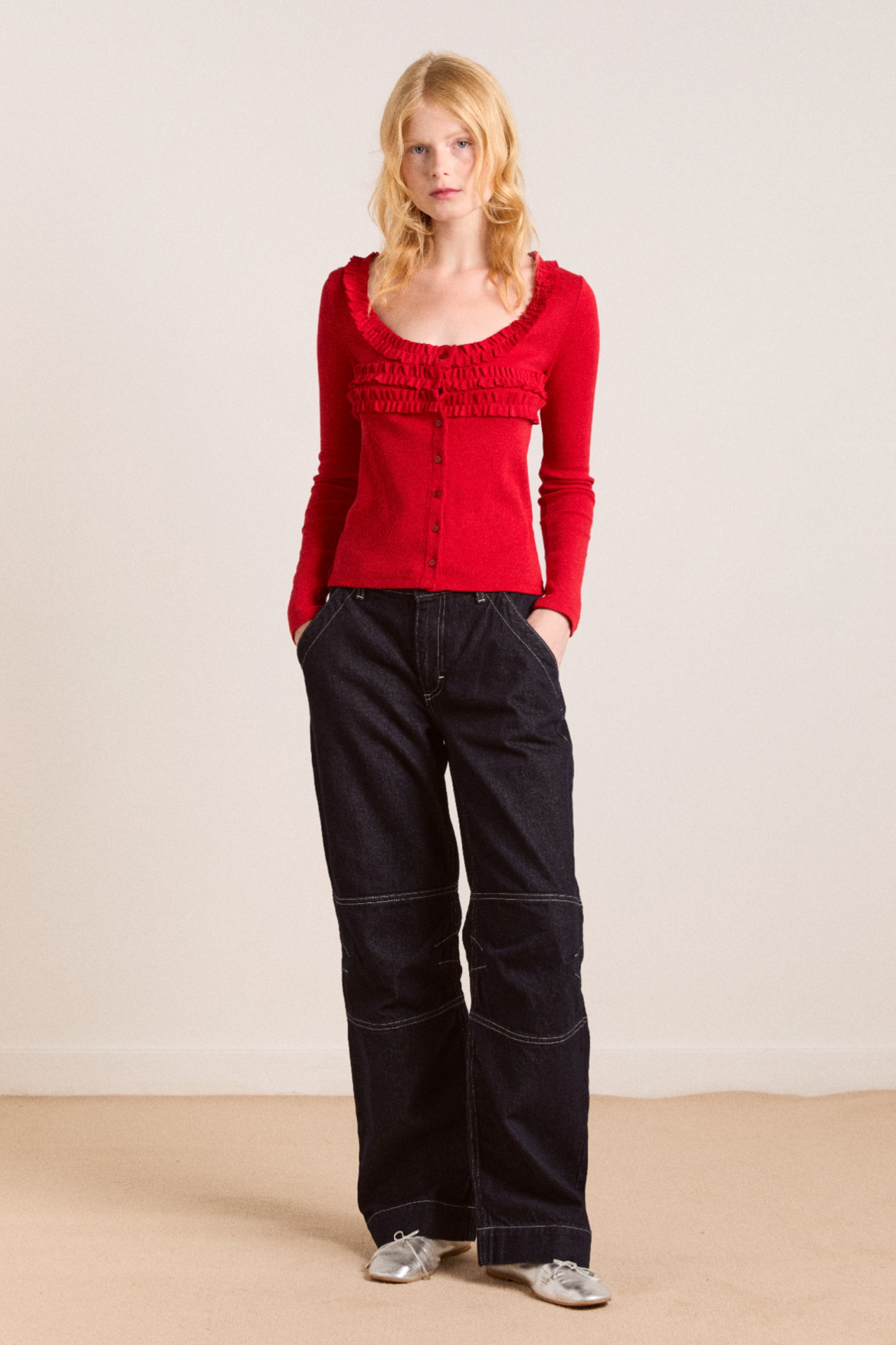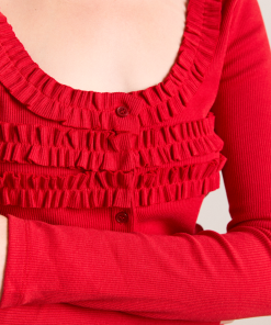 The Varsha Cardigan in cherry is the epitome of easy wearing. Crafted from soft jersey rib fabric with a rounded neckline, and finished with sweet vintage-inspired ruffle detailing. The Varsha will be on high rotation.