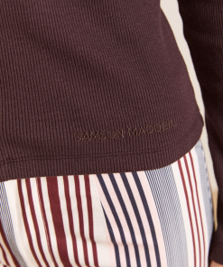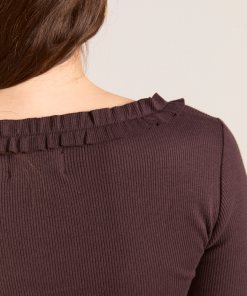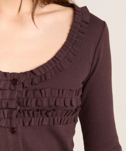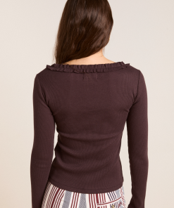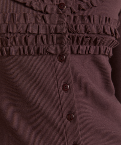 The Varsha Frilly Cardi in brown is the epitome of easy wearing. Crafted from soft jersey rib fabric with a rounded neckline, and finished with sweet vintage-inspired ruffle detailing. The Varsha will be on high rotation.